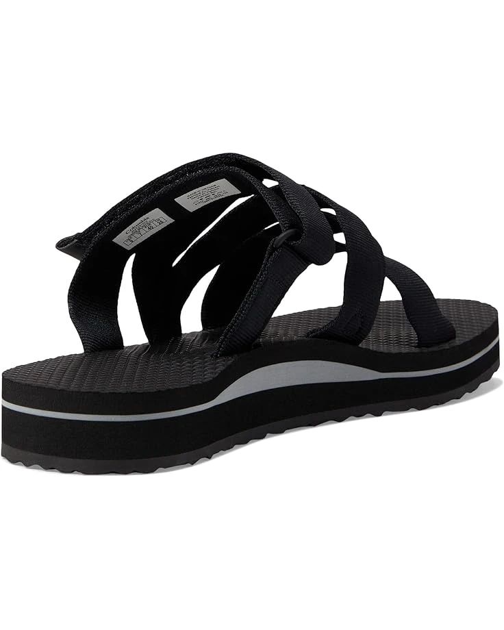 - Webbing slide sandals with a hook-and-loop strap closure.