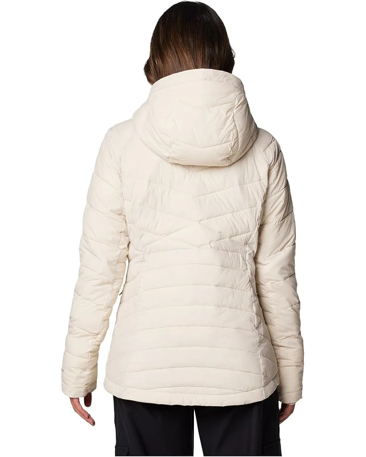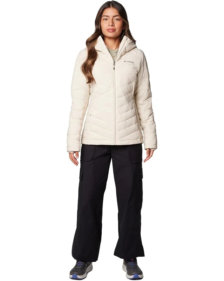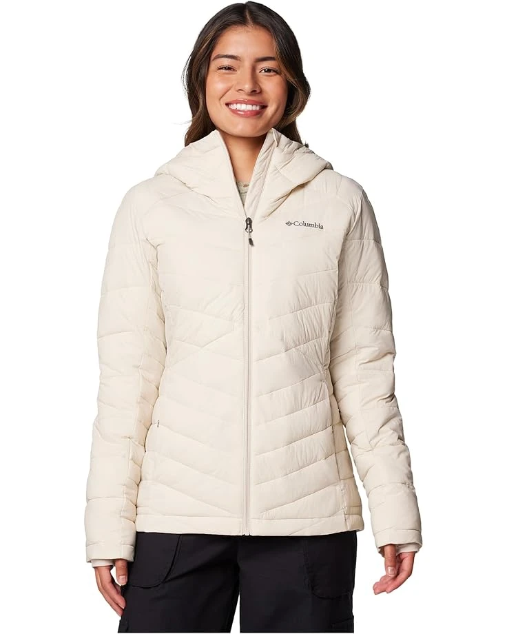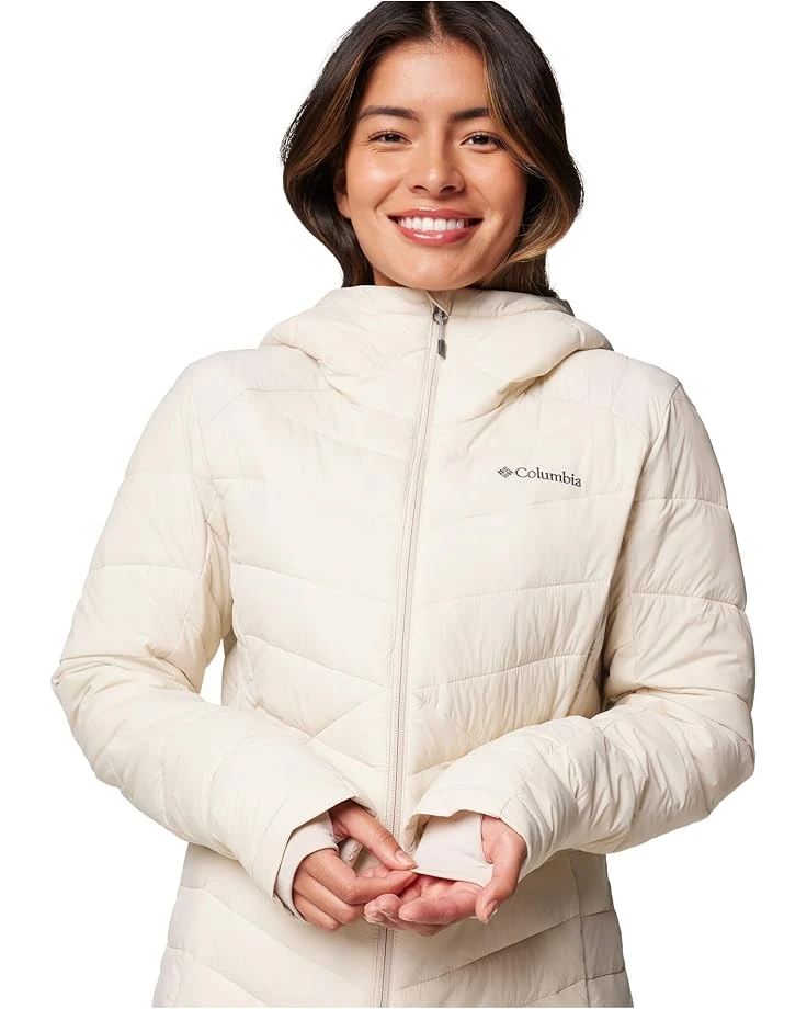 - The Columbia® Joy Peak™ II Hooded Jacket has a plush fleece lined hood and collar to keep you protected from cold weather elements. It features a chin guard, zippered front closure, long sleeves, and quilted construction to provide warmth.