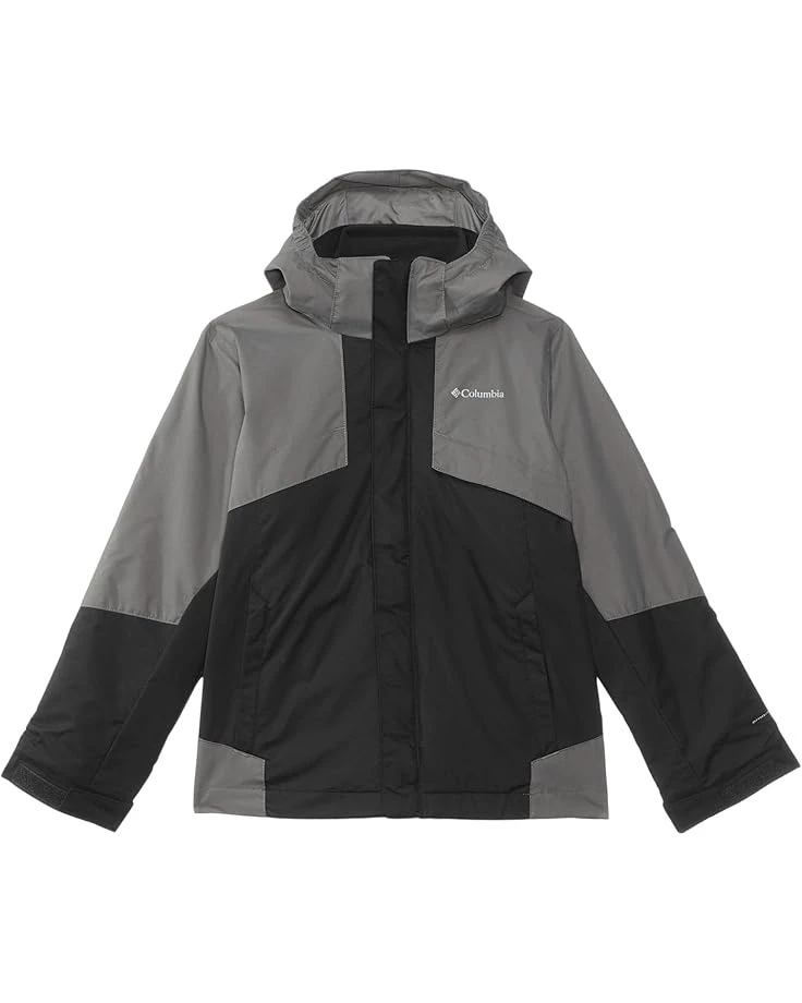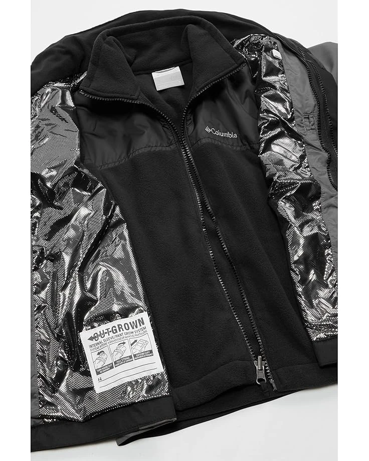 - Featuring a Zip-in and 3-point Interchange System, the Columbia® Kids Bugaboo™ III Fleece Interchange Jacket can be worn as two separate layers or zipped together for a classic ski jacket. The OUTGROWN™ grow system of the jacket features hidden, removable seams that let you extend sleeves by 1.5″ while the Omni-Tech™ critically seam-sealed construction prevents moisture from seeping into it. Made from waterproof-breathable fabric, this zip-up jacket is lined with Omni-Heat™ thermal-reflective fabric that retains warmth using the breathable silver dots to keep your kid warm and comfortable as the temps drop. The long sleeves, removable and adjustable taffeta-lined storm hood, and adjustable cuffs offer added comfort and protection.