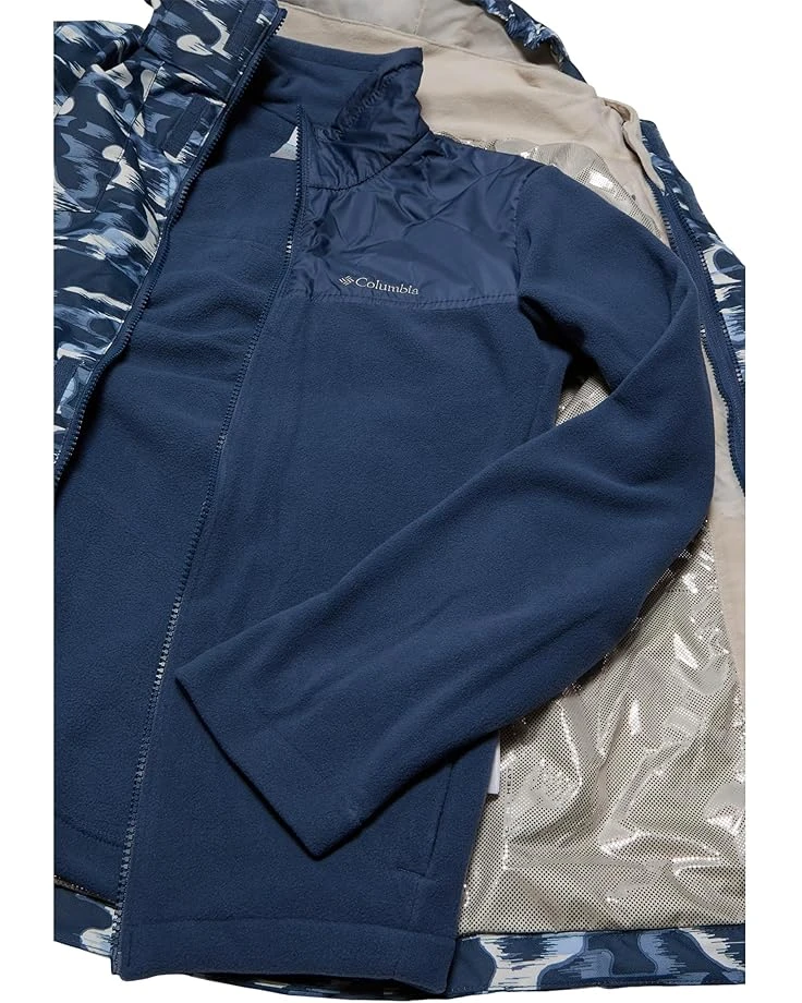 - A perfect choice for the cold weather, the Columbia® Kids Bugaboo™ III Printed Fleece Interchange jacket features Omni-Tech waterproof/breathable critically seam-sealed construction that keeps your kid comfortable and dry all day. The OUTGROWN™ grow system of the jacket lets you extend the cuffs for multi-season wear while the zip-in and 3-point Interchange System allows your kid to wear each jacket as a shell, a liner, or zipped together for full protection. It comes with long sleeves, adjustable cuffs, a removable taffeta-lined hood with an adjustable tab on the back, and a straight hem. The Omni-Heat™ reflective lining retains warmth for long hours. Waterproof and windproof, let your kid enjoy cold-weather adventures wearing this zip-up jacket.