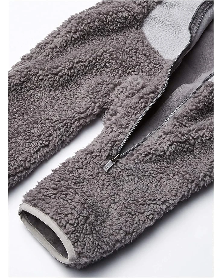 - Ultrasoft high-pile fleece fabrication is crafted with stretch binding along the trim. Attached hood with decorative ears offers a playful finish. Constructed with an asymmetrical front-zip closure, long sleeves, and embroidered brand marking at the upper left.