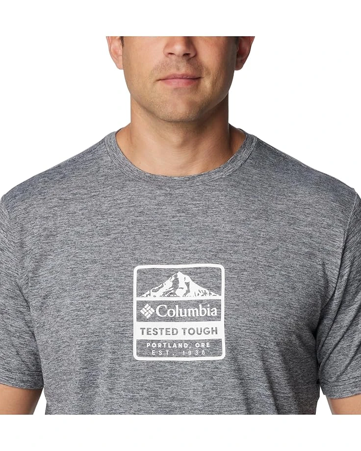 - Casual and comfortable, the Columbia® Kwick Hike™ Graphic Short Sleeve Tee is perfect for your everyday look. The pull-on style tee has a crew neckline, short sleeves, and a straight hem. It features a graphic print at the center front that adds a statement touch to the classic look.